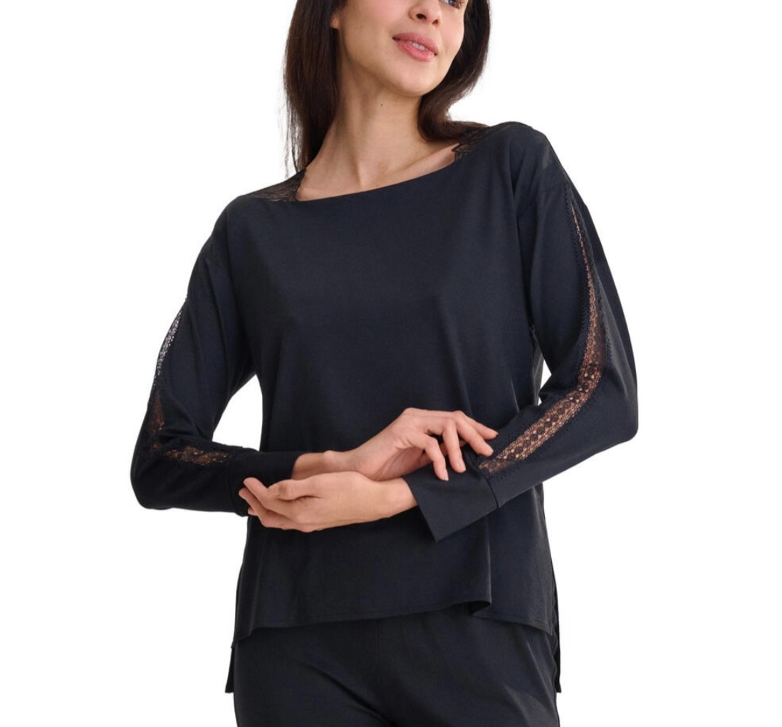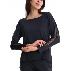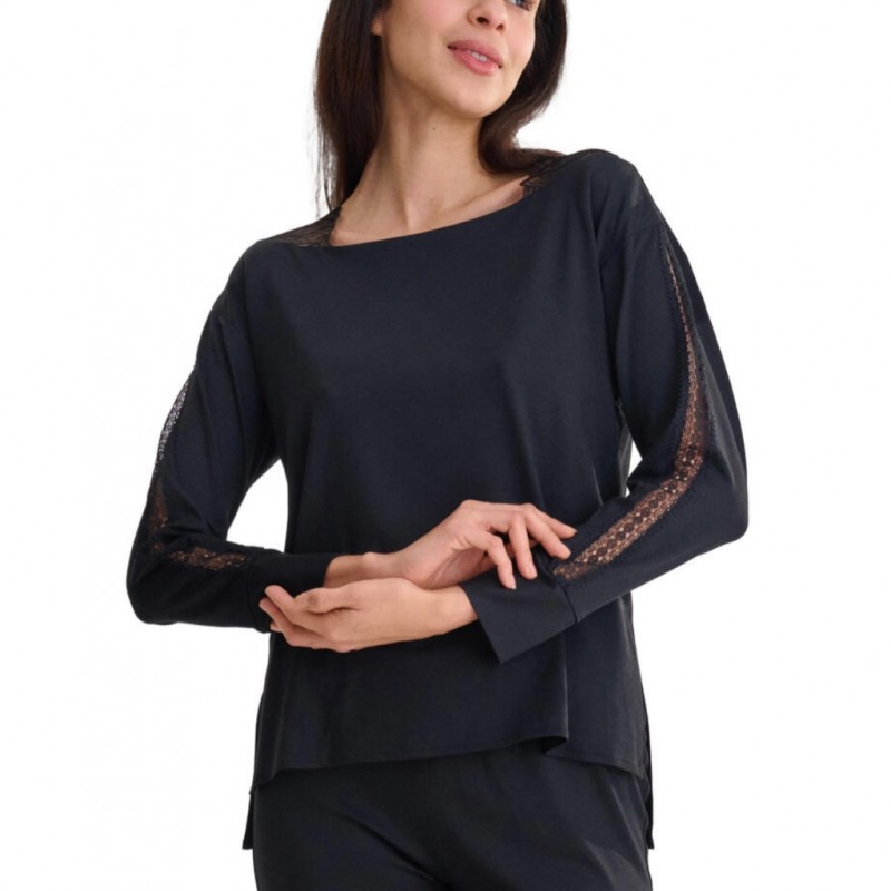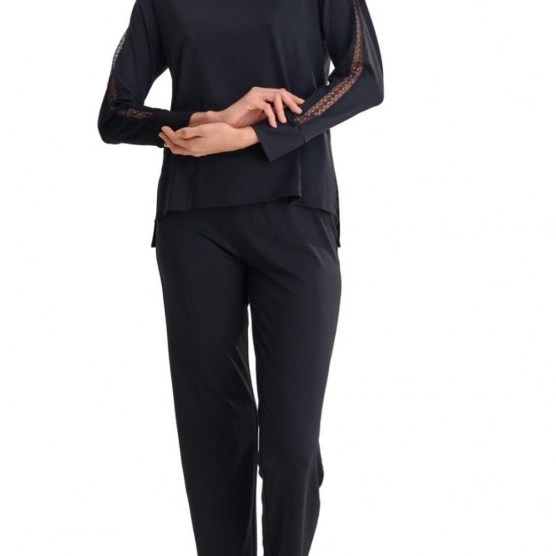 Pyjama élégant et confortable avec un empiècement brodé luxueux sur l'épaule. Dentelle fine décorative comme détail sur toute la longueur de la manche, terminée par un ourlet plus large. Fentes latérales qui se prolongent jusqu'au dos allongé. Pantalon de pyjama simple avec une taille élastique plus large et une dentelle fine sur le bas avec une fente.