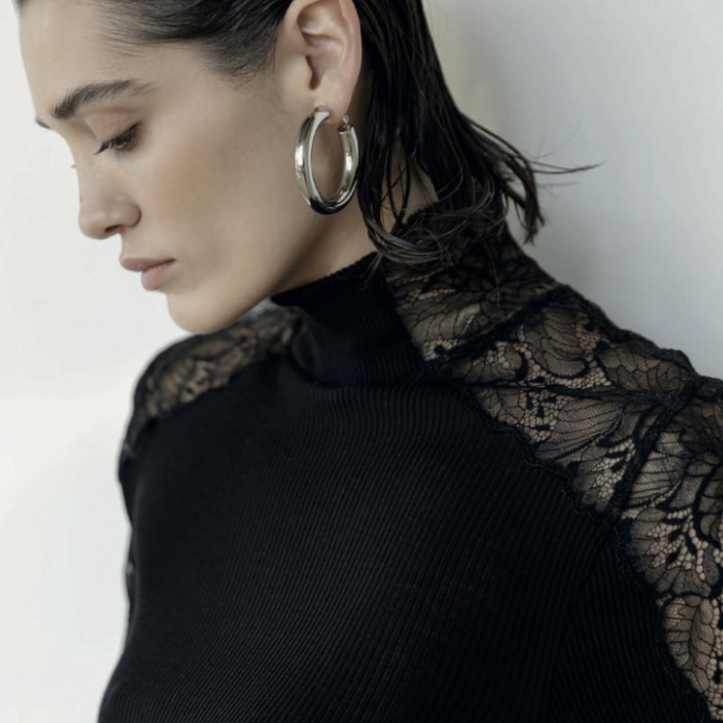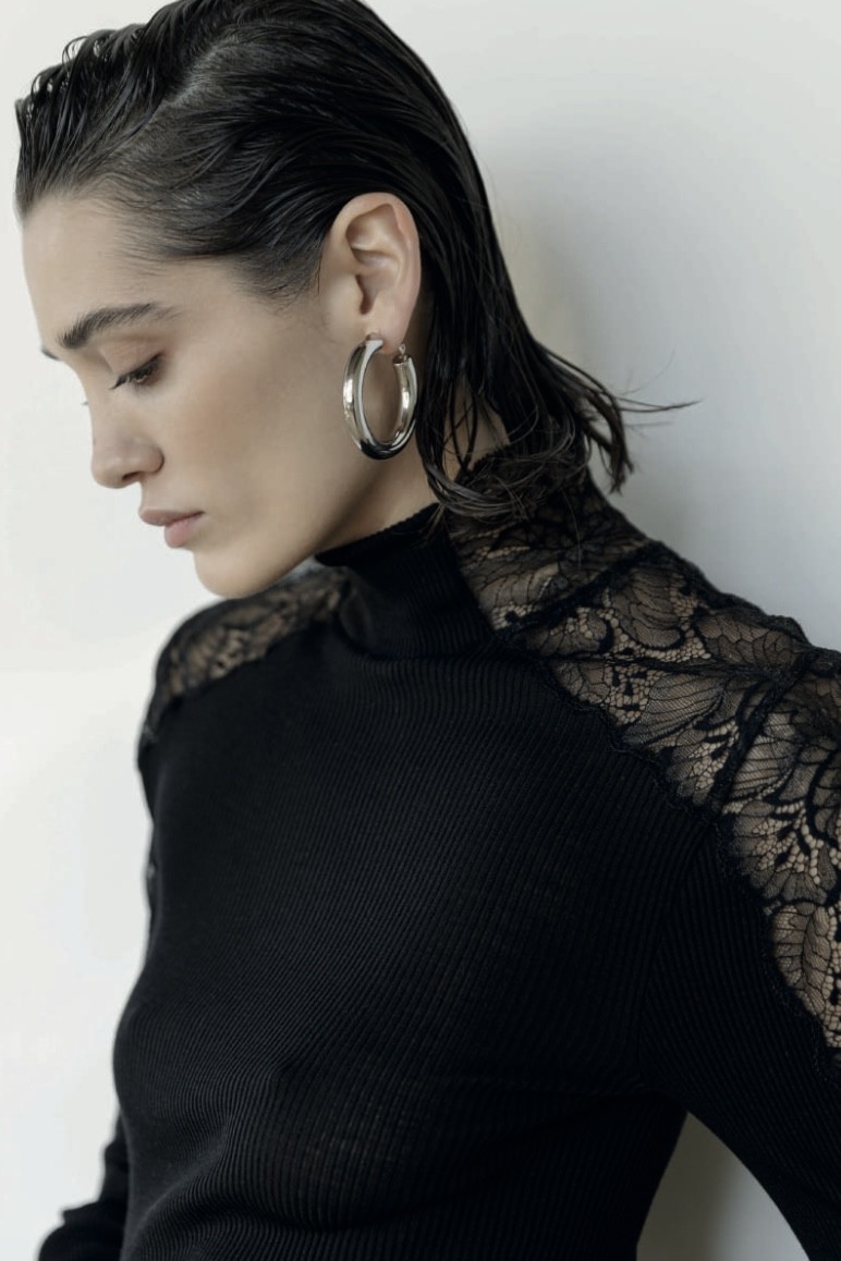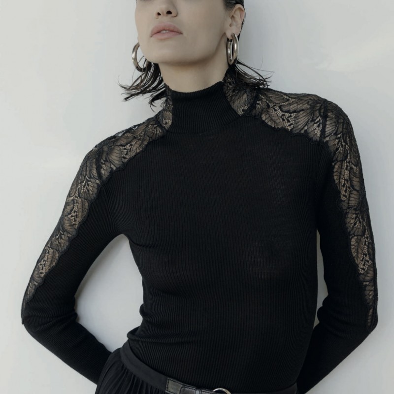 Pull haut de gamme en laine et soie, le col et les manches sont rehaussées d’une sublime dentelle de calais.